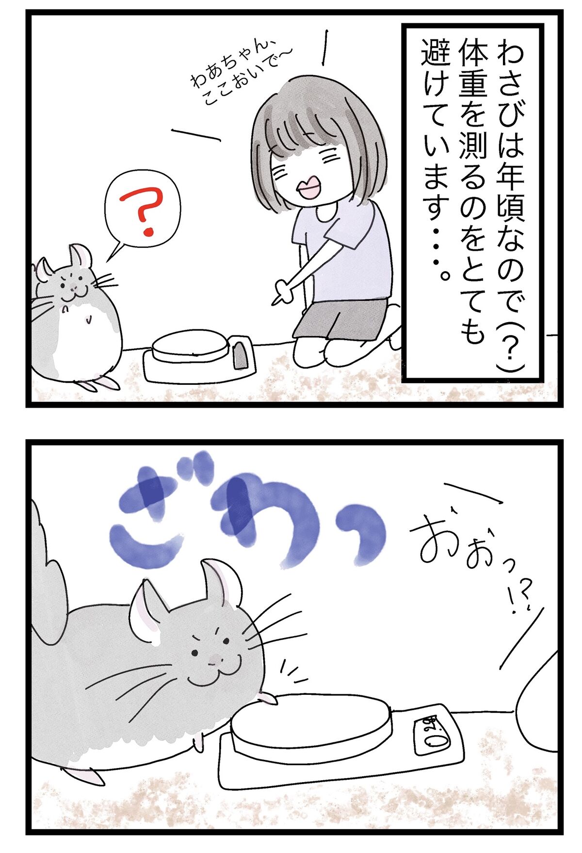 2022年07月31日 体重を測らせてくれない年頃のわさび 尻尾の重さは別に測らなくて良いのだ。。。たまに奇跡的に測らせてくれるのですが、約500gあります。↓言うな!!!👊↓わさびに許してもらえないシリーズ タグ :#チンチラ#絵日記#漫画#日常漫画#マンガ にほんブログ村 「わさび先生との日々」カテゴリの最新記事 < 前の記事次の記事 > コメント コメントフォーム 名前 コメント 記事の評価 リセット リセット 顔 星 情報を記憶 コメントを投稿する