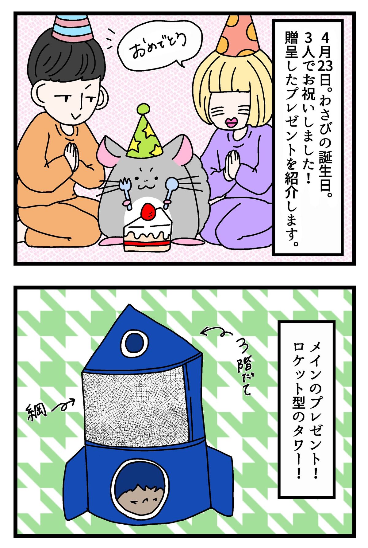 2023年05月02日 わさびへの誕プレを紹介します!!! 好みを選べると嬉しい!!【自炊つらスンギ〜】 【1歳の誕生日に贈ったものも気に入っている】 タグ :#チンチラ#漫画#漫画が読めるハッシュタグ#毎日更新 にほんブログ村 「わさび先生との日々」カテゴリの最新記事 < 前の記事次の記事 > コメント コメント一覧 🐳52 2023年05月02日 10:17 ↑↑↑ 🈁に、星★★★★★が、つけられるの、初めて知った、すまない🙏 おめでとう(๑´ㅂ`๑) 🐭㊗️ 最上階へは、どぉやっていくの?? 外から?? たむたむ 2023年05月03日 12:33 >>1 今のところキャットタワーから飛び乗って最上階に行っているよ笑 コメントフォーム 名前 コメント 記事の評価 リセット リセット 顔 星 情報を記憶 コメントを投稿する