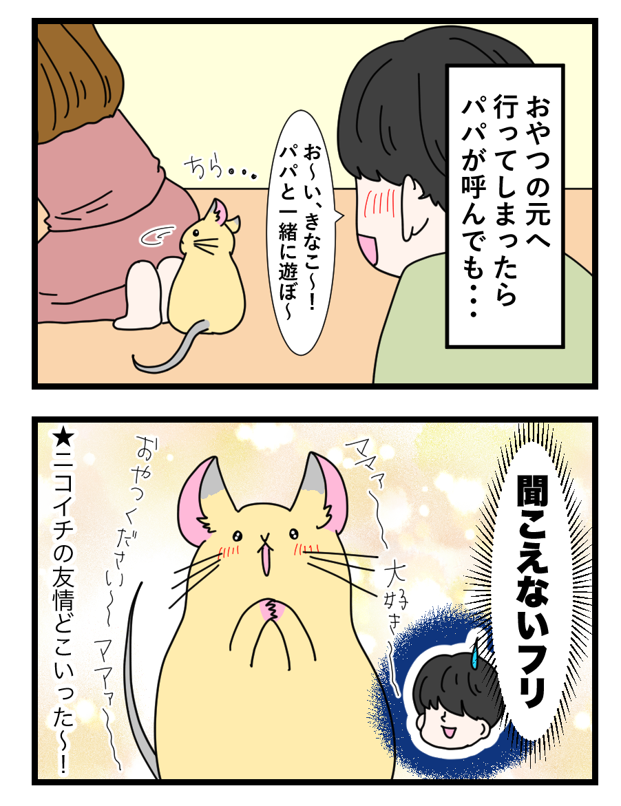 2023年10月23日 〈もふもふ話vol.8〉おやつには誰も勝てない とろろくんパパから、ネズミーランドメンバーの投稿をいただきました〜!やっぱりおやつには勝てないですよね、我が家もです笑▼実際のきなこくん▼ちっさい口から出てるベロ、刺さりました笑【もふもふエピソード募集中です!】 【ネズミーランドのとろろくんエピ】 【眠気メーター】 タグ :#チンチラ#デグー#小動物漫画#絵日記ブログ#小動物ブログ#動物イラスト#ネズミさん#フォロワーさんの話#もふもふ にほんブログ村 「フォロワーさんのもふもふ話」カテゴリの最新記事 < 前の記事次の記事 > コメント コメント一覧 🐳52 2023年10月25日 10:38 きなこ君、小さいし、愛らしい🐭❤ チンチラchan✖️テグーchan、からんで遊んだりするのかな??🤔❤ たむたむ 2023年10月25日 15:16 >>1 スリムで可愛いよね。ど、どうだろうか・・・??? コメントフォーム 名前 コメント 記事の評価 リセット リセット 顔 星 情報を記憶 コメントを投稿する